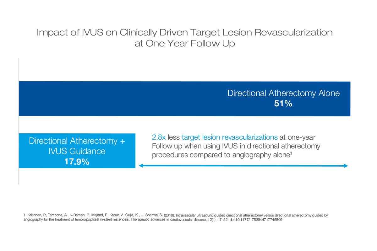 Discover the impact of intravascular ultrasound (IVUS) on clinically driven target lesion revascularization when combined with Directional Atherectomy, as opposed to using Directional Atherectomy alone. The one-year follow-up results reveal a reduction of 2.8 instances of target lesion revascularization when IVUS is employed in directional atherectomy procedures, compared to relying solely on angiography. This highlights the contribution of IVUS/intracoronary imaging in improving outcomes and minimizing the need for subsequent revascularization procedures in this context.